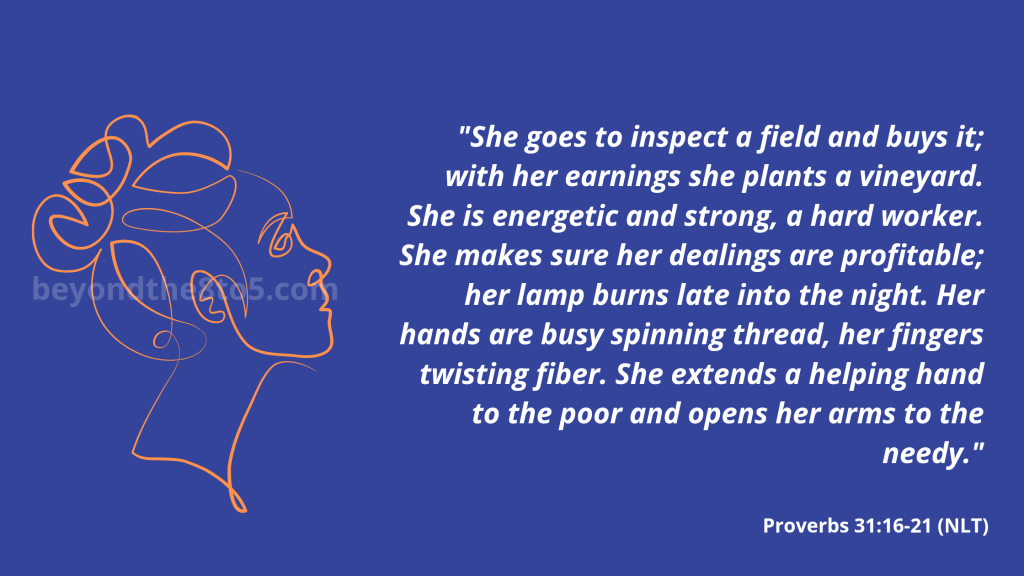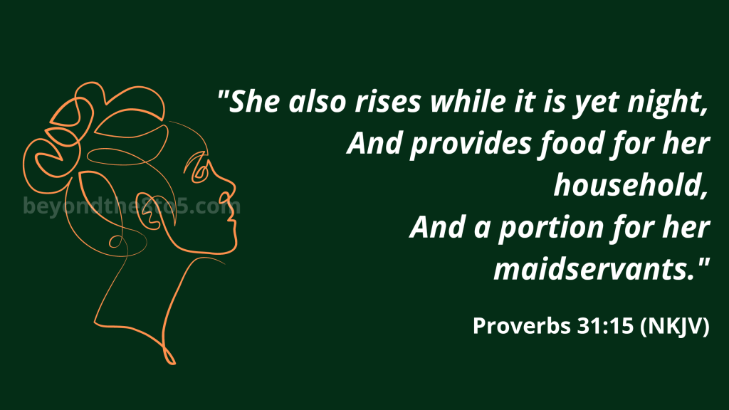 I used to read Proverbs 31:15 and think: Ei, so if you wake up later than 3am does that make you a Proverbs 31 man instead??? Because it looks like the Proverbs 31 woman wakes up at dawn to go and bring food and money. So then you cannot sleep in ever, right? But that night, whilst I was reflecting on this scripture, I realised something: it was not about the hour of day, as I was thinking.