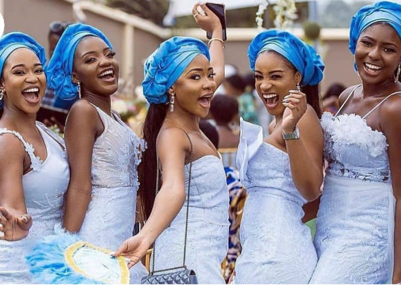 “Sure.” Ricka stepped back out and returned with 7 ladies, all dressed in white lace outfits with blue headgear. Ricka herself was dressed in a similar outfit. The ladies – Emefa’s friends and cousins – walked into the room with comments of “Aww congratulations!”, “You look so amazing!” and “You make such a gorgeous bride!”.