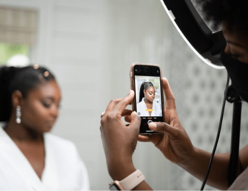 The photographer started, “Okay my beautiful ladies can we stand round the bride? Mrs, please sit in the makeup chair.” Then videographer asked, “Can we have some music?” One of Emefa’s cousins brought out her phone and turned on some music.